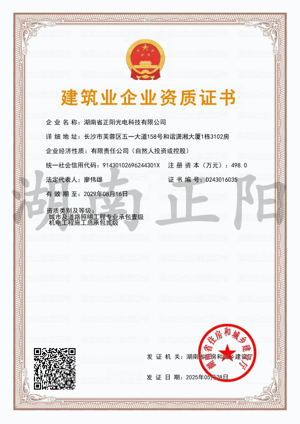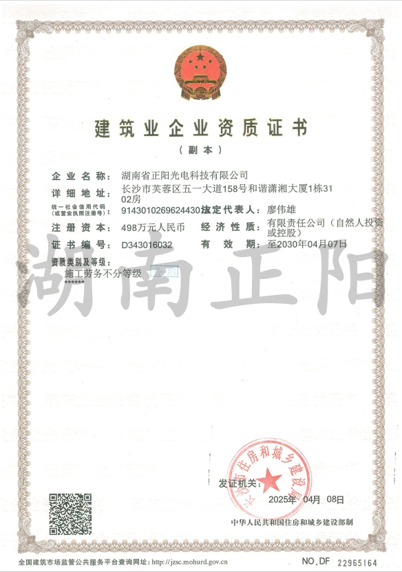2025年4月8日,經(jīng)長沙市住房和城鄉(xiāng)建設(shè)局審核批準,湖南省正陽光電科技有限公司成功獲得“施工勞務(wù)”資...